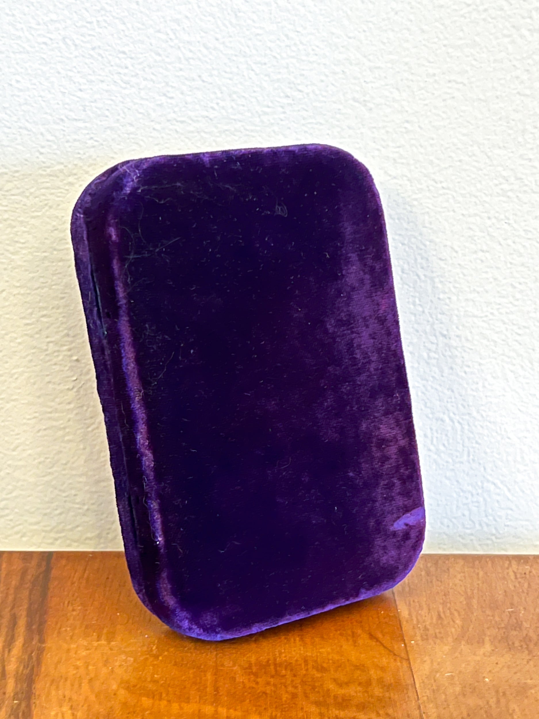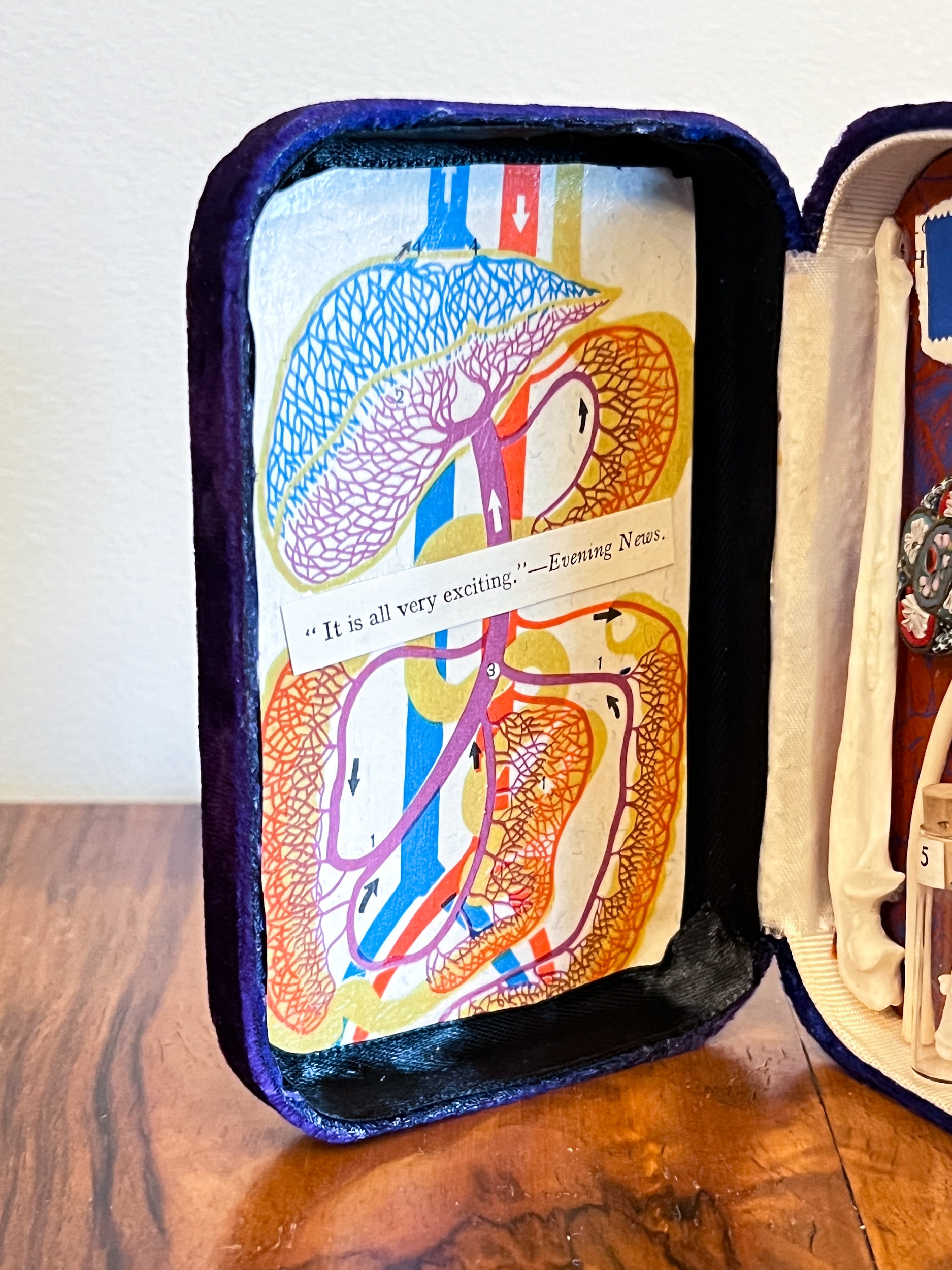 This charming little mini curiousity cabinet is made with a purple velvet jewelry box, circa 1940s. It includes a vintage medical diagram, antique skeleton key, assortment of feathers, antique glass trade bead, various bones, an antique watchmakers' vial with bones, an antique micro mosaic jewelry finding from Italy, and a verse from an antique book. Right side is decoupaged with hand-printed paper from Nepal.